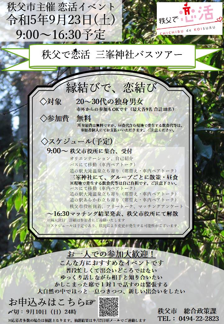 道の駅、三峯神社を巡るバスツアーを楽しみながら出会える恋活イベントを開催します!