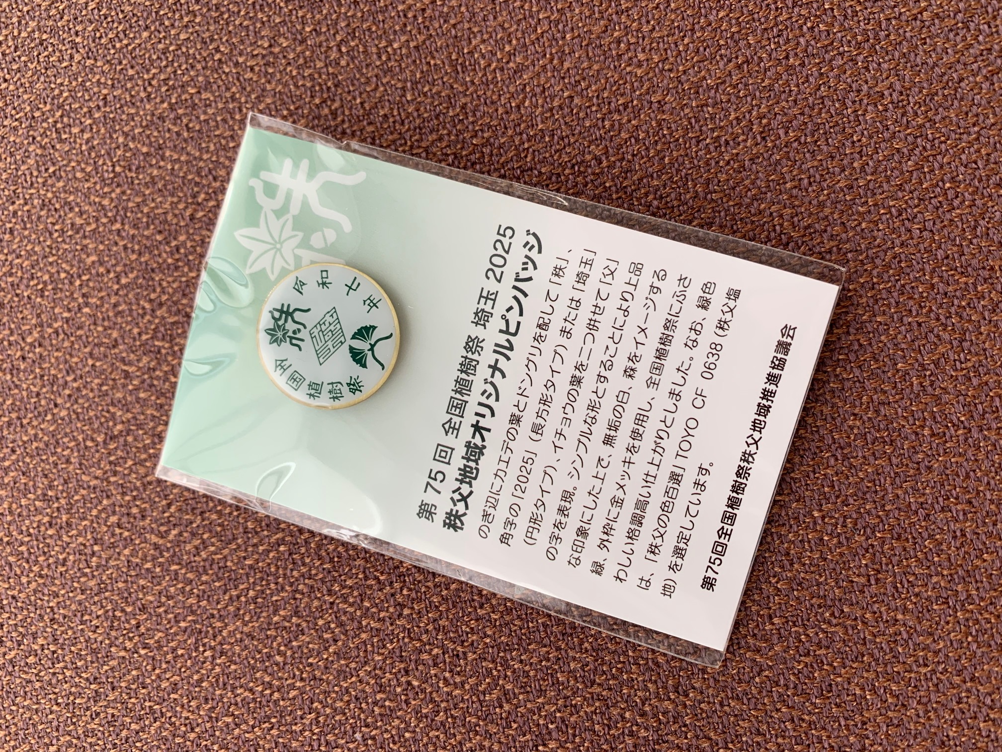 令和7年春に秩父ミューズパークを主会場として開催される「第75回全国植樹祭」をPRするため、秩父地域限定のオリジナルピンバッジを作成しました。 この度、下記のとおり有償にて頒布いたします。