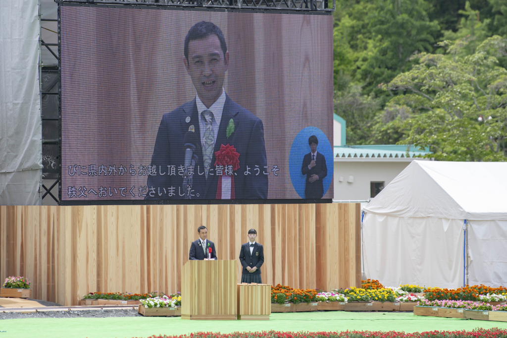 5月25日(日)、天皇陛下の御臨席を仰ぎ、第75回全国植樹祭が秩父ミューズパークで盛大に開催されました。埼玉県での開催は昭和34年以来、66年ぶりとなり、秩父地域にとって歴史に残る特別な日となりました。この瞬間を迎えられたことに、心から感謝の気持ちでいっぱいです。 植樹祭には、県内外から約4,600人が参加し、「人・森・川 つなげ未来へ 彩の国」という大会テーマのもと、健全で豊かな森林を未来へ引き継ぐことを共有する演出が大会全体を通じて展開されました。 これにあわせ、秩父市の奉祝記念事業として、「秩父祭・川瀬祭 笠鉾・屋台特別公開」が実施されました。当日、天皇陛下は秩父神社にお立ち寄りになり、小鹿野子ども歌舞伎の鑑賞や秩父夜祭で使用される笠鉾や屋台をご覧になられました。私はお出迎えの際、秩父市民を代表して心からの歓迎の挨拶を申し上げました。 式典プロローグの歓迎の挨拶では、この地域が歴史と文化資源に恵まれた観光地であること、さらに県内で最も多くの森林を有し、その森林から育まれた豊かな水が人々の暮らしに安心を与えていることをお伝えしました。また、森林の保全整備に積極的に取り組んでいることを強調し、「活樹」の意識を持って森林資源の循環利用を進め、美しい森林を未来の子どもたちへつないでいくことをお約束しました。 記念式典では、天皇陛下よりお言葉を賜り、かつて武甲山や雲取山、両神山に登られ、美しい自然に魅了された思い出を語られたことに、深い感動を覚えました。天皇陛下のお手植えやお手播き、三旗掲揚、そして式典や各種アトラクションでは、秩父市の緑の少年団が多くの参加者の前でしっかりと介添えなどの役割を果たしている姿を見て、感動が胸に迫りました。 また、秩父地域の県立高校4校の生徒たちが「式典アシスタント」として参加し、表彰者の案内などを担当していました。生徒たちは緊張しながらも一生懸命に役割を果たし、来場者の皆様に温かいおもてなしを提供していました。このような素晴らしい若者たちがいることを誇りに思います。彼らの活躍を通じて、秩父地域の未来が明るいものであると確信しました。私たち大人は、若者の背中を押し、互いにさらなる成長を応援していくべきだと感じました。 これらの成功は、関係各所の皆さまの熱意とご尽力があったからこそ成し遂げられたものです。心より感謝申し上げます。皆さまの支えがあってこそ、私たちはこの特別な日を迎えることができました。また、全国からお越しいただいたお客様をおもてなしの心で迎えられたことも、秩父市の誇りです。 植樹祭と記念事業を通じて、私は秩父地域の素晴らしさを改めて実感しました。皆様の祭りに対する深い愛着と、地域を支える強い結束力を感じました。この地は、自然と風土が調和し、互いに助け合いながらまちを築いてきた「わかちあい」の精神が根付いています。秩父の美しさは、文化や歴史、伝統、そして熱意によって支えられています。それらが今回の植樹祭と記念行事の成功に繋がりました。 この素晴らしい秩父の地を、私たちの子や孫、さらにはその先の子孫に誇り高く手渡していくために、私は秩父市長として全身全霊で働く覚悟を新たに決意しました。「個性ある地域の力を活かして、わかちあいの秩父をつくる」という理念のもと、皆さまの生命と財産を守り抜く覚悟を持って、市政に全力を注いでいきたいと思います。 私たち一人一人が森林を大切にし、その恵みを次世代へと引き継いでいくことが、今求められている使命です。皆さまと共に、地域の特性を活かした森林保全や再生に向けた取り組みを強化し、次世代に美しい秩父の森を引き継いでいきます。 改めて、市民の皆さま、本当にありがとうございました。これからも共に手を携え、秩父市をより良い未来へと導いていきましょう。皆さまのご支援とご協力を心よりお願い申し上げます。私たちの手で、秩父の未来を輝かしいものにしていきましょう。