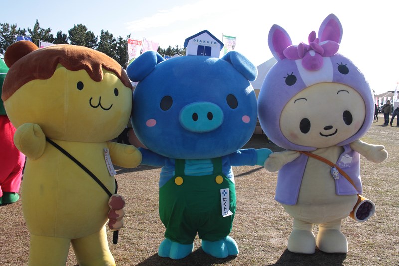 「たくトン」(大阪府・(株)宅都ホールディングス)と「ちりゅっぴ」(愛知県知立市)だよ。たくトンは3兄弟なんだって。ちりゅっぴは馬のパーカーを着ていて、頭は「かきつばた」ってお花のブローチがついてるんだって。カワエエ。