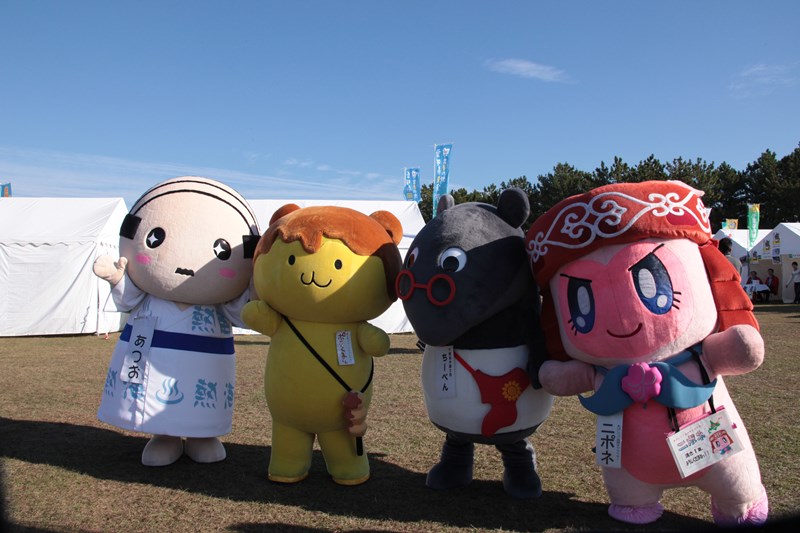 一番左が「あつお」(熱海温泉ホテル旅館協同組合)と一番右が「ニポネ」(北海道網走市)だよ。あつおくんは見た目は“おっさん”だけど妖精なんだって。いろんな妖精いるな~~。ニポネは勇者なんだって。たしかにりりしい…
