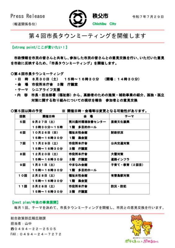 第4回市長タウンミーティングは、8月30日(土)の午後3時から本庁舎3階庁議室で開催予定です。テーマは「シニアライフ支援」です。高齢者向けの施策や補助事業の紹介、孤独・孤立対策に関する取り組みをお話しした後、皆さまと意見交換を行います。皆さんとお話しできることを心待ちにしています!