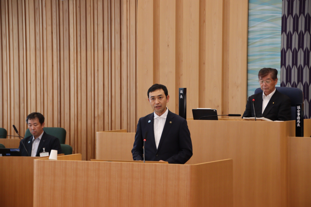 冒頭の挨拶では、8月31日(日)に秩父市総合防災訓練を実施することや、8月6日に東京ビッグサイトで開催された第57回交通安全こども自転車全国大会で、秩父第一小学校が団体の部で2連覇を達成したことを報告し、議案22件の概要をご説明しました。