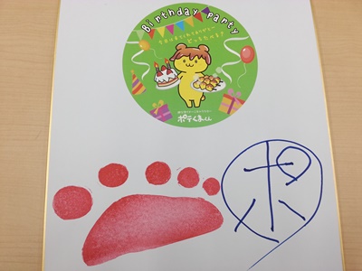 ステージの部が終わったら、ボクの「サイン会」だよ。がんばって練習したからね~~、カキカキ。この色紙には、ボクの手型と、今日のお誕生会のために作った特製ステッカーが貼ってあるんだよ。
